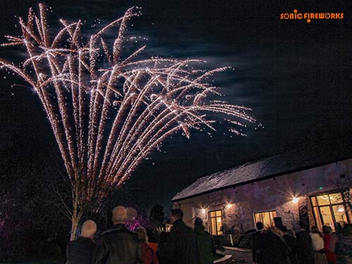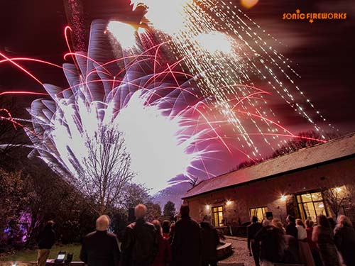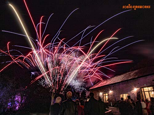 Fireworks are usually fired from the orchard behind the car park. The audience view from the courtyard looking up over the wall. The style of display will depend on the time of year as the venue is also a working farm. (For example during lambing season we will need to fire a whisper display.)